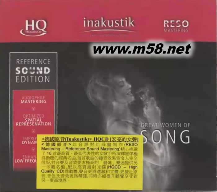 宏亮的女聲 GREAT WOMEN OF SONG HQCD(INAKUSTIK宏亮系列)(m58.net) 音源對比母盤制作(RESO Mastering – Reference Sound Mastering)是採用現(xiàn)今最高解像度技術(shù)使原母盤內(nèi)的音源效果得以改良和提升,清澈度更高,動態(tài)范圍更寬,低頻更重更深,是音響發(fā)燒友夢寐以求的音效。這種新制式配合高質(zhì)鐳射光碟(HQCD – High Quality CD)更是完美無瑕的配合。【宏亮的女聲(Great Women Of Song)】,精心挑選了16首最高質(zhì)、最具代表性的女歌手所演繹旋律極為動聽的經(jīng)典名曲,每首歌曲的錄音效果皆令人完全信服,對音樂及音效要求極高的「發(fā)燒」樂迷提供另一示范名盤,這些歌曲包括: