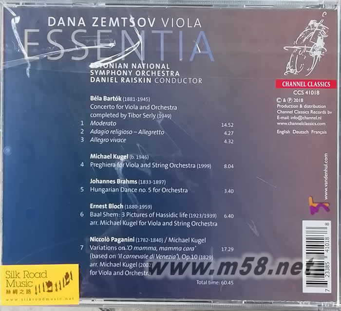 本質(zhì) Dana Zemtsov [Essentia](m58.net) Dana Zemtsov (viola)、Daniel Raiskin (conductor)、 Estonian National Symphony Orchestra 1. 丹娜.澤姆佐夫(Dana Zemtsov)出生於墨西哥一個(gè)音樂(lè)世家,祖母和父母均是中提琴演奏家,父親是荷蘭中提琴好手米哈伊爾.澤姆佐夫(Mikhail Zemtsov),母親是俄羅斯最優(yōu)秀的女中提琴家之一朱莉婭.迪納斯坦(Julia Dinerstein),而她自己則師承俄羅斯中提琴巨匠邁克爾.庫(kù)格爾(Michael Kugel),可說(shuō)系出名門(mén),其出眾的琴技更是廣受認(rèn)同。 2. 出生於俄羅斯圣彼得堡的著名指揮家丹尼爾.萊斯金(Daniel Raiskin)來(lái)自音樂(lè)世家,自幼受庭訓(xùn),入讀圣彼得音樂(lè)學(xué)院學(xué)習(xí)中提琴和指揮,后轉(zhuǎn)到荷蘭和德國(guó)繼續(xù)學(xué)業(yè)並展開(kāi)其中提琴演奏活動(dòng),迅即闖出名堂。他精通的樂(lè)種非常廣泛,特別是中提琴演奏的曲目,雖然以傳統(tǒng)樂(lè)曲為主,但常為樂(lè)迷帶來(lái)嶄新的節(jié)目,這些特質(zhì)全由他轉(zhuǎn)作指揮后展示出來(lái),他與丹娜.澤姆佐夫的合作更是天作之合。 3. 由丹尼爾.萊斯金帶領(lǐng)愛(ài)沙尼亞國(guó)立交響樂(lè)團(tuán)(Estonian National Symphony Orchestra)配合丹娜.澤姆佐夫演奏五位來(lái)自不同年代的著名作曲家包括巴托克(Béla Bartók)、邁克爾.庫(kù)格爾(Michael Kugel)、布拉姆斯(Johannes Brahms)、布洛克(Ernest Bloch)和柏格尼尼(Niccolo Paganini)他們專為中提琴演奏而作的作品,首首精彩,娓娓動(dòng)聽(tīng)。 4. 從每首樂(lè)曲的演奏,樂(lè)迷可全窺丹娜.澤姆佐夫和丹尼爾.萊斯金對(duì)中提琴這樂(lè)器透徹地了解及獨(dú)具的個(gè)人風(fēng)格,音準(zhǔn)無(wú)瑕,技巧紥實(shí),音色優(yōu)美感性,是難以抗拒的精雕細(xì)琢經(jīng)典美樂(lè)。