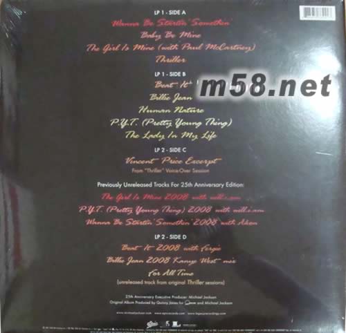 LP1 SIDE A 1.Wanna Be Startin' Somethin' 2.Baby Be Mine 3.Girl Is Mine 4.Thriller LP1 SIDE B 5.Beat It 6.Billie Jean 7.Human Nature 8.PYT (Pretty Young Thing) 9.The Lady In My Life LP2 SIDE C 10.Voiceover - Vincent Price 11.Girl Is Mine - Michael Jackson & 12.Will.I.Am 13.PYT (Pretty Young Thing) - Michael Jackson & Will.I.Am 14.Wanna Be Startin' Somethin' - Michael Jackson & Akon LP2 SIDE D 15.Beat It - Michael Jackson & Fergie 16.Billie Jean (2008 Kanye West mix) 17.For All Time (Previously Unreleased)