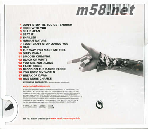 01. DON'T STOP TIL YOU GET ENOUGH 02. ROCK WITH YOU 03. BILLIE JEAN 04. BEAT IT 05. THRILLER 06. HUMAN NATURE 07. I JUST CAN'T STOP LOVING YOU 08. BAD 09. THE WAY YOU MAKE ME FEEL 10. DIRTY DIANA 11. SMOOTH CRIMINAL 12. BLACK OR WHITE 13. YOU ARE NOT ALONE 14. EARTH SONG 15. BLOOD ON THE DANCE FLOOR 16. YOU ROCK MY WORLD 17. BREAK OF DAWN 18. ONE MORE CHANCE