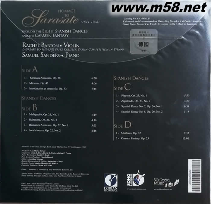 Homage To Sarasate 向薩拉薩蒂致敬 黑膠 唱片圣經推介(m58.net) Rachel Barton (緯查·巴頓) (violin)、 Samuel Sanders (塞繆爾·桑德斯)(piano) 美國著名小提琴家緯查·巴頓於1994年的首次錄音出版一鳴驚人之作,她以卓越嫻熟的演奏技巧演繹薩拉薩蒂璀璨炫麗的經典名作包括「西班牙舞曲」及「卡門幻想曲」等。 專輯被發燒界及古典樂壇譽為「絕世的小提琴天碟」,中外最具權威性音樂雜誌包括TAS、CD Review、Stereo Sound及音響論壇等全面推薦。 緯查·巴頓採用1617年阿瑪悌家族(Amati)所精製之名琴「羅布柯維茲(Lobkowitz)」締造那美得令人窒息的音色,使這專輯更為亮麗奪目。 名鋼琴家塞繆爾·桑德斯伴奏,相得益彰的演繹,效果更為動人。 此錄音首次以原裝母盤精心泡製雙黑膠,音效更為顯著突出。
