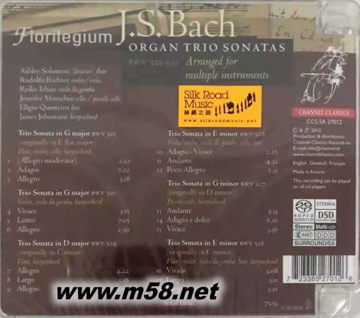 價格為估,以實到貨為準! 巴哈 [給管風琴的三重奏奏鳴曲]Bach [Organ Trio Sonatas] SACD(m58.net) 有"音樂之父"美譽的德國傳奇音樂家巴哈(J.S.Bach)是18世紀最有成就及極具音樂造詣的音樂家,經典作品不計其數,他創作風格廣泛,種類多元化,每種類別的作品均備受樂迷所愛戴,深得樂界的認同,足以証明他備受尊崇的地位。由英國最頂尖的古樂合奏團「羣芳譜合奏團(Florilegium)」傾力帶來巴哈多首<給管風琴的三重奏奏鳴曲(Organ Trio Sonatas)>,包括[G大調三重奏奏鳴曲,BWV525(Trio Sonata in G major,BWV525)]、[G大調三重奏奏鳴曲,BWV530(Trio Sonata in G major,BWV530)]、[D大調三重奏奏鳴曲,BWV529(Trio Sonata in D major,BWV529)]、[E小調三重奏奏鳴曲,BWV528(Trio Sonata in E minor,BWV528)]、[G小調三重奏奏鳴曲,BWV527(Trio Sonata in G minor,BWV527)]與及[E小調三重奏奏鳴曲,BWV526(Trio Sonata in E minor,BWV526)],經重新編曲成給多種樂器包括長笛、小提琴、大提琴、大鍵琴、古鍵琴等的演奏,效果更為豐富,層次更突出,以專業SACD發燒錄音制式製作,豐盈的空間感妙不可言!