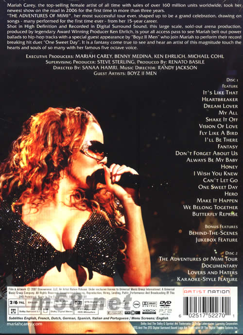 第2片DVD則超值收錄“Vision Of Love”、“One Sweet Day”、 “Hero”、 “Shake it off” 、 “Honey”、 “We Belong Together”等6首現場版Karaoke。以及由名導史派克李(Spike Lee)執導,在演唱會播放的影片「Lovers & Haters」,呈現她如何走過起起伏伏的事業與人生,以及如何利用她的天賦與才華,成為歷史上最成功的歌手之一。 此外還收錄長達40分鐘的演唱會幕後紀實?!綯he Adventures of Mimi天后再臨世界巡迴演唱會】是瑪麗亞在環球音樂旗下的首張DVD作品,天后誠意十足地帶來豐富超值的內容,您怎麼可以不收藏呢?