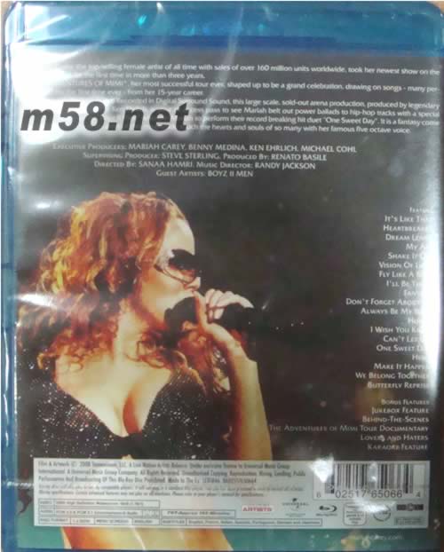 1 It's like that 2 Heartbreaker 3 Dream lover 4 My all 5 Shake it of 6 Vision of love 7 Fly like a bird 8 I'll be there 9 Fantasy 10 Don't forget about us 11 Always be my baby 12 Honey 13 I wish you knew 14 Can't let go 15 One sweet day 16 Hero 17 Make it happen 18 We belong together 19 Butterfly reprise 20 Behind-the-scenes (Bonus feature) 21 Jukebox feature Bonus feature) 22 The adventures of Mimi tour 23 Documentary 24 Lovers and haters 25 Karaoke-style feature