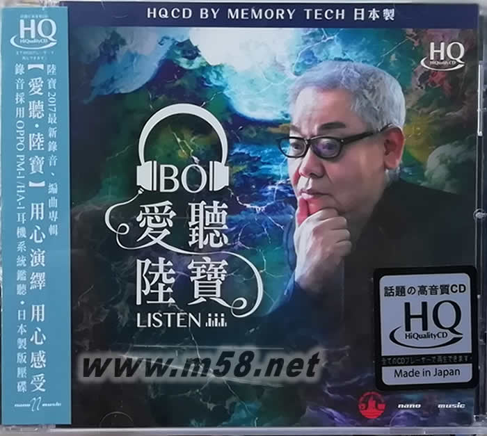 愛(ài)聽(tīng)陸寶 HQCD (日本制)(m58.net) 陸寶2017年第三張最新專輯 (風(fēng)行出品) 【用心演繹 用心感受】 陸寶2017年最新錄音、編曲、『愛(ài)聽(tīng)-陸寶』,包括原創(chuàng)歌曲【再細(xì)聽(tīng)】。DXD調(diào)音工程由錄音大師Terence負(fù)責(zé)操刀,全程採(cǎi)用OPPO PM1/HA-1耳機(jī)系統(tǒng)鑑聽(tīng),日本Memory Tech製版壓碟。首批限量珍藏版、附獨(dú)立編號(hào)。