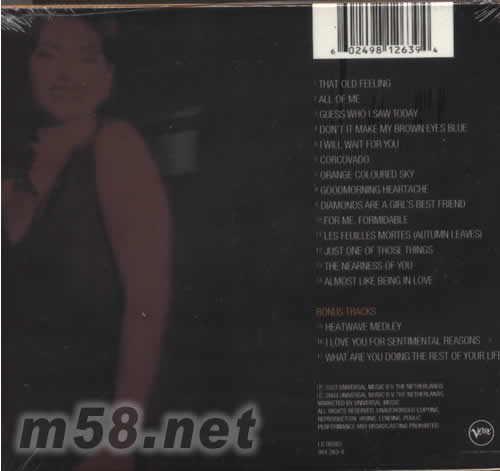 01. That Old Feeling 02. All of Me 03. Guess Who I Saw Today 04. Don't It Make My Brown Eyes Blue 05. I Will Wait For You 06. Corcovado 07. Orange Coloured Sky 08. Goodmorning Heartache 09. Diamonds Are A Girl's Best Friend 10. For Me, Formidable 11. Les Feuilles Mortes (Autumn Leaves) 12. Just One Of Those Things 13. The Nearness Of You 14. Almost Like Being In Love BONUS TRACKS 15. Heatwave Medley 16. I Love You For Sentimental Reasons 17. What Are You Doing The Rest Of Your Life