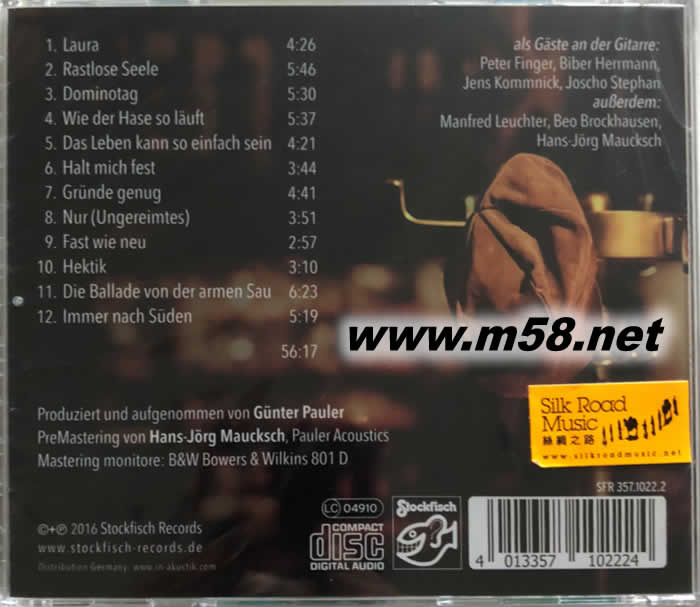 一半永恒 Eine halbe Ewigkeit(民謠)(m58.net) 1. 來自東柏林,風靡歐洲樂壇超越四十年的著名唱作人及結他手沃納•萊默希(WernerLämmerhirt)以演唱現代民謠最為人所稱頌,亦是「發燒樂界」的竉兒,專輯[一半永恆(eine halbe Ewigkeit)]是他首次與同是「發燒界」巨擘「老虎魚」精誠合作,難能可貴。 2. 萊默希特的聲音低沉,帶點沙啞卻性感非常,他那輕鬆隨意式的演唱風格更是他的形象標記,惹人好感。 3. 清脆俐落,亮麗鏗鏘的結他演奏亦是萊默希特備受讚賞的原因之一,他演唱和演奏每一粒音符與樂句皆成為醉人的美樂,這次與以錄製人聲加結他而揚名國際的「老虎魚」合作,如魚得水,天作之合。 4. 萊默希特在製作此專輯時獲知患病,最近完成整個錄音才離世,他在樂界發光發亮的才華與成就隨著[一半永恆(eine halbe Ewigkeit)]這專輯劃上完滿句號,雖然可惜,但極其珍貴。