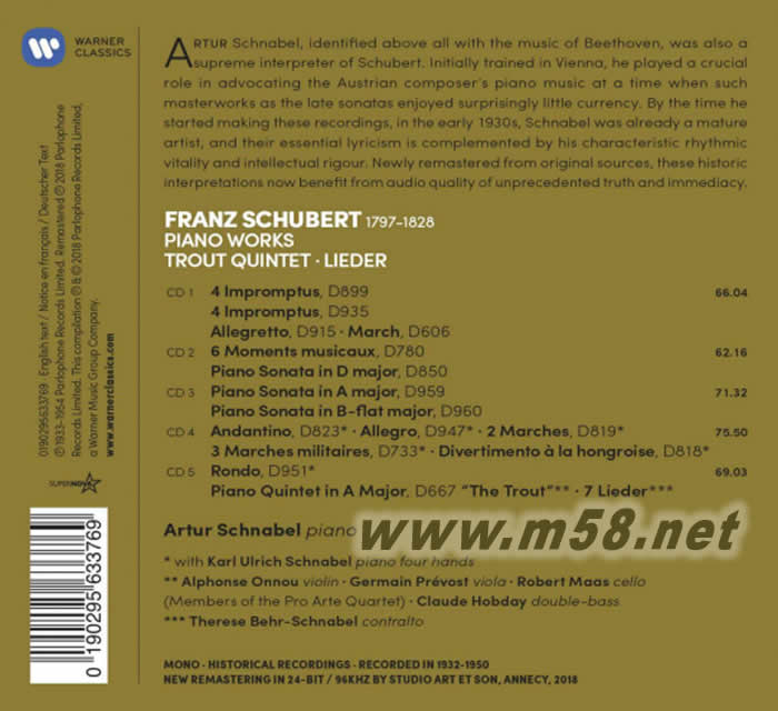 PIANO WORKS, TROUT QUINTET, LIEDER世紀(jì)典藏超值盒 舒伯特:鋼琴作品, 《鱒魚》鋼琴五重奏, 藝術(shù)歌曲 - 許納貝爾 5CD套裝專輯背面圖片