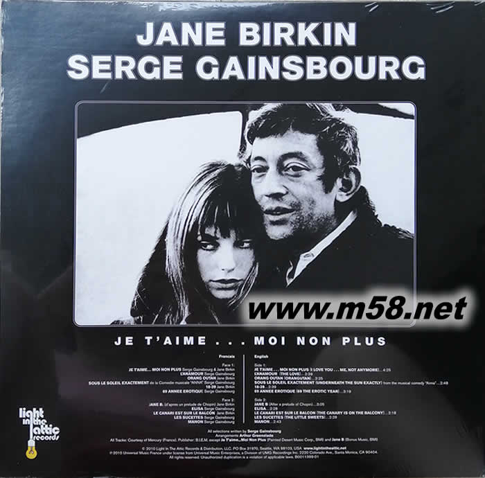 Serge Gainsbourg - 180g 33RPM LP 黑膠(m58.net) 簡·柏金(Jane Birkin)1946年12月14日出生在倫敦。她的父親大衛是英國一個有名的貴族,簡剛出生時他正擔任皇家海軍的指揮官。簡的母親朱迪·甘伯爾(在英國的戲劇舞臺上,恐怕朱迪·坎貝爾這個名字要更有名氣),是一位聲譽卓著的演員,也是英國著名劇作家Noel Coward所鐘愛的繆斯女神。簡從小就是在這種資產階級的而極富藝術氛圍的家庭環境中,跟她的哥哥安德魯、妹妹琳達一起長大的。 賽日·甘斯布,又譯作塞爾日·甘斯布,是一位法國歌手、作曲家、鋼琴家、電影作曲家、詩人、畫家、編劇、作家、演員和導演。他身上薈萃了詩人的氣質,法國人的幽默。他是法國流行音樂史上最重要的人物之一。他的作品經常充滿挑釁性和誹謗性,他的曲風多元,使得他難以被歸類,他的作品已深入人心,被視為世界世界上最有影響力的流行音樂家之一。[1] 他的抒情作品經常因為挑釁,幽默,諷刺或顛覆的原因加入大量巧妙的文字游戲來欺騙聽眾。他歌曲中的文字游戲常見類型有擬聲詞,押韻,首音互換和雙關語等等。在甘斯布的職業生涯中,他寫了超過500首歌曲。1991年去世后,法國為他降半旗致哀。