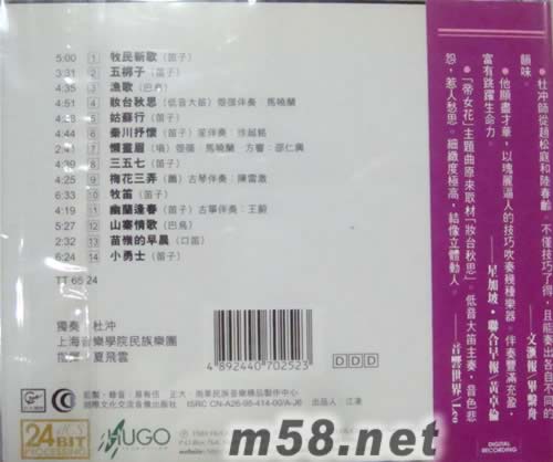 幽蘭逢春(m58.net) 八九年五月十大最佳古典CD之一 --香港電臺(tái)第四臺(tái) 杜沖的演奏原出他是一位全才,十四首曲子都是不同角度的動(dòng)態(tài)曲目 --純音樂(lè)雜志/送延益 極度傳神而逼真的錄音,是受樂(lè)者所必藏 --臺(tái)灣.音樂(lè)與音響雜志 杜沖師徒趙松庭和陸春齡.不僅技巧了得,且能奏出各自不同的韻味 --文匯報(bào) 他原盡才華,以瑰麗逼人的吹奏幾種樂(lè)器.伴以豐滿充盈富有跳躍生命力. --星加坡.聯(lián)合早報(bào)/黃卓倫 [帝女花]主題曲原來(lái)取材[妝臺(tái)秋思].低音大笛主奏,音色悲怨,惹人愁思.細(xì)致度極高,皆像立體動(dòng)人 --音響世界/LEO