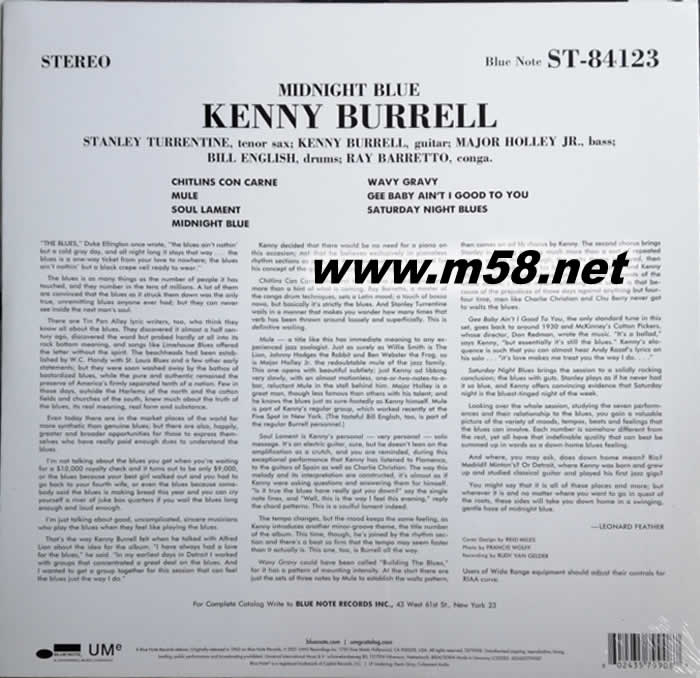 午夜藍調 MIDNIGHT BLUE (爵士吉它手) 黑膠(m58.net) Kenny Burrell, guitar Major Holley, Jr., bass Bill English, drums Ray Barretto, conga 在近代的爵士吉他樂手中,Kenny Burrell 無疑是一個無法被遺忘的名字,在他發行的數十張專輯中,可以聽見搖擺、酷派、拉丁、放克等不同風格的爵士演出。而在這些曲風之外,因為早期音樂啟發與演奏生涯的影響,他的身體其實流滿著「藍調」的血液。 Kenny Burrell至今仍活躍於樂壇的吉他大師,1950年進入韋恩州立大學音樂系,次年成為Dizzy Gillespie六重奏的一員,並灌錄了首張專輯,穩定地開展自新的演奏生涯。Burrell喜歡用直接、簡約的旋律線打動聽者,從而表達出優雅溫和的吉他音色,表現出他自然天成的個性。我們很少在他的作品中發現他過渡使用音效,或扭曲原始的感覺,相反的,他個人相信強烈的情感依然可以透過流暢、自然的手法完整的宣泄出來。自70年代起,風格獨特并德高望重的Kenny Burrell 任教于洛杉磯的數所大學,桃李爭春名師出高徒,同時也樂于與其它樂手合作,并持續地灌錄自己的作品,作為著名爵士吉它手、爵士樂導師,他長青樹般地始終在自我成長、融合進步。