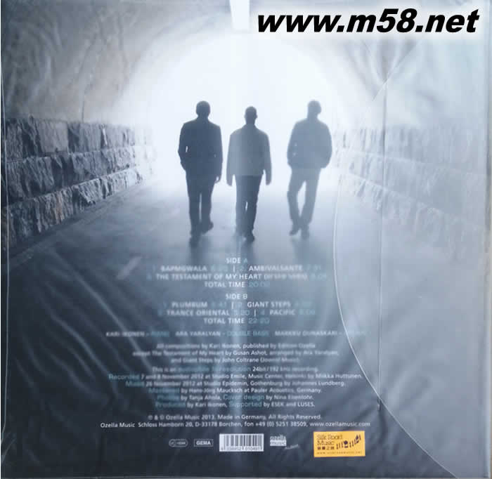 卡里.伊科寧(Kari Ikonen) 是芬蘭現今最杰出的爵士音樂家之一,他的卡里克科六重奏(Karikko Sextet)蜚聲國際,飲譽全球。伊科寧本身是鋼琴家,鍵盤樂器演奏家和作曲家,他的作品絕不艱深難明但需要高水平的演奏技巧演繹,旋律有流行曲的元素,容易使人接受但不流於庸俗,加上他出息的琴技,不少國際知名的音人喜歡與他合作,特別是演出他的作品,其中巴括英格麗.延森(Ingrid Jensen)、鮑勃.摩西斯(Bob Moses)、馬格努斯.布奧、文森特.庫爾圖瓦斯(Vincent Courtois)和羅恩.麥克盧爾(Ron McClure)等,而他的作品亦榮獲美國朱利葉斯.亨普希爾作曲獎(Juliud Hemphill Composition Awards (USA)第一名和意大利爵士樂作曲(Italian Scrivere in Jazz)一等獎,其音樂造詣之高,可想而知。他近年伙拍國際知名的低音大提琴手艾拉‧ 雅拉利安(Ara Yaralyan)及鼓手馬克庫‧ 奧細塞卡里(Markku Ounaskari)組成卡里‧伊科寧三重奏(Kari Ikonen Trio),除了作巡迴演出外,亦從事專輯錄音,他們的首張作品剛好面世,三人使出渾身解數,全情投入地演繹伊科寧的多首精彩作品包括【Bapmgwala】、【Ambivalsante(矛盾)】、【The Testament Of My Heart(我心中的遺愿)】、【Plumbum(鉛)】、【Giant Steps(巨大的步履)】、【I Fall In Love Too Easily(我太容易墮入愛情)】、【Trance Oriental(東方夢想)】及【Pacific(太平洋)】等,最重量級的組合演繹最出息的作品,加上以180克33 1/3轉處女黑膠為載體,金刻直刻母盤由「老虎魚」錄音室專責處理,純模擬聲效,音色更為自然和暖,創造了一張令人完全信服的爵士樂示范盤。