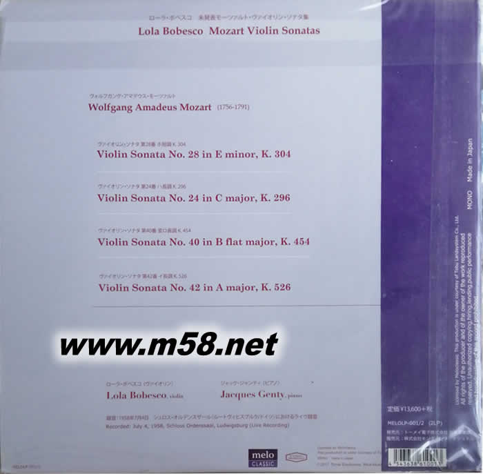 博貝斯庫 莫扎特小提琴奏鳴曲 MOZART VIOLIN SONATAS 黑膠 日本版專輯背面圖片