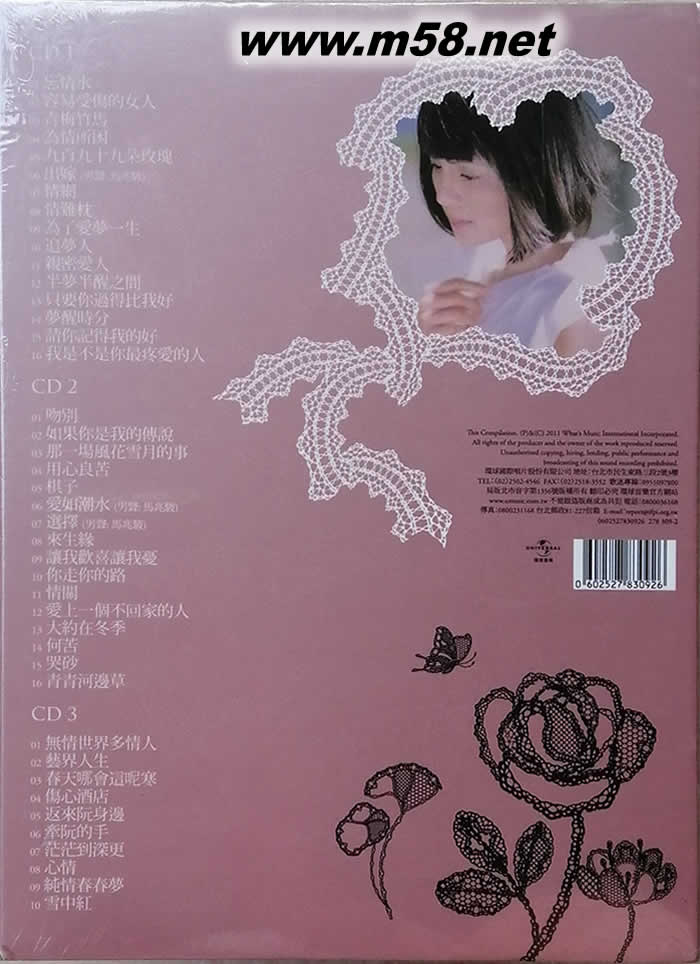 DISK 1 CD 1. 忘情水 2. 容易受傷的女人 3. 青梅竹馬 4. 為情所困 5. 九百九十九朵玫瑰 6. 出嫁(男聲: 馬兆駿) 7. 情網 8. 情難枕 9. 為了愛夢一生 10. 追夢人 11. 親密愛人 12. 半夢半醒之間 13. 只要你過得比我好 14. 夢醒時分 15. 請你記得我的好 16. 我是不是你最疼愛的人 DISK 2 CD 1. 吻別 2. 如果你是我的傳說 3. 那一場風花雪月的事 4. 用心良苦 5. 棋子 6. 愛如潮水(男聲: 馬兆駿) 7. 選擇(男聲: 馬兆駿) 8. 來生緣 9. 讓我歡喜讓我憂 10. 你走你的路 11. 情關 12. 愛上一個不回家的人 13. 大約在冬季 14. 何苦 15. 哭砂 16. 青青河邊草 DISK 3 CD 1. 無情世界多情人 2. 藝界人生 3. 春天哪會這呢寒 4. 傷心酒店 5. 返來阮身邊 6. 牽阮的手 7. 茫茫到深更 8. 心情 9. 純情春春夢 10. 雪中紅