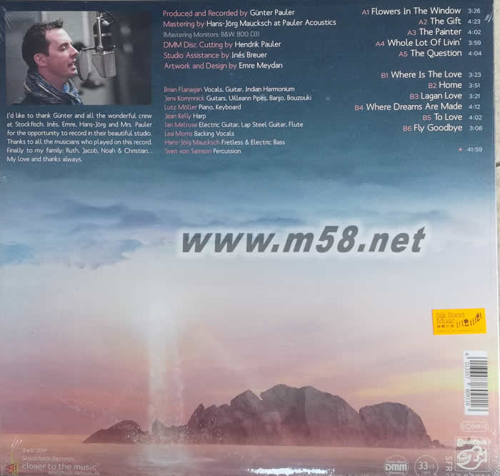 造夢之處(Where Dreams Are Made) 黑膠 老虎魚作品(m58.net) Brian Flanagan與發燒音樂界巨擘「老虎魚」初度合作 一副美妙動人的聲線, 沉實醇厚, 演唱自己的作品感情拿捏精準 Hi Fi Review :一支結他,一把耙聲…結實卻透露,清新卻老練 1. 愛爾蘭的唱作詩人、作曲家,亦被譽為最具天份的作家布賴恩•弗拉納根(Brian Flanagan)與發燒音樂界巨擘「老虎魚」初度合作,擦出明亮熾熱的火花。 2. 弗拉納根天賦的音樂和寫作才華完全展示在他的最新專輯[造夢之處(Where Dreams Are Made)]的每一首歌曲內,歌詞充滿哲理涵義,配以優美動聽的旋律,譜出一首接一首令人感動的抒情小曲。 3. 弗拉納根擁有一副美妙動人的聲線,沉實醇厚,演唱自己的作品感情拿捏精準,恰到好處,是最無可比擬的最佳演繹。 4. 「老虎魚」顯赫的專業錄音技術,精致中融入優雅質感,黑膠版本採用1:1直刻金屬母盤(DMM)製作,並以180克處女黑膠唱片為載體,人聲輿樂器聲融合得更為立體自然,越聽越有味道,是聆聽至高的樂趣。