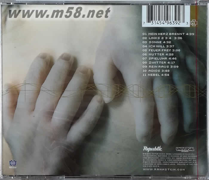 1 Mein Herz Brennt - 4:39 2 Links 2 3 4 - 3:36 3 Sonne - 4:32 4 Ich Will - 3:37 5 Feuer Frei! - 3:11 6 Mutter - 4:32 7 Spieluhr - 4:46 8 Zwitter - 4:17 9 Rein Raus - 3:09 10 Adios - 3:49 11 Nebel - 4:54