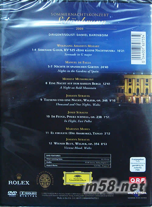 1-4:MOZART:SERENADE IN G major 5-7:FALLA:NIGHTS IN THE GARDENS OF SPAIN 8:MUSSORGSKY:A NIGHT ON BALD MOUNTAIN 9:JOHANN STRAUSS:THOUSAND AND ONE NIGHT,WALTZ 10:JOSEF STRAUSS:IN FLIGHT,FAST POLKA 11:MARIANO MORES:EL FIRULETE(DIE ARABESKE),TANGO 12:JOHANN STRAUSS:VIENNA BLOOD,WALTZ