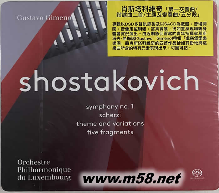 價格為估,以實到貨為準! 肖斯塔科維奇 [第一交響曲/諧謔曲二首/主題及變奏曲/五分段]Shostakovich Symphony No. 1 SACD SACD(m58.net) 1. 肖斯塔科維奇的[F小調第一交響曲,作品編號10(Symphony No. 1 in F minor Op. 1]是他仍在學時期所創作令人震驚的作品,這作品充份展示了作曲家天賦的音樂才華,富創造性,充滿幻想,風格獨特但成熟,現由年輕自信,指揮新彗星葛斯塔夫.希梅諾(Gustavo Gimeno)帶領盧森堡愛樂樂團(Orchestre Philharmonique du Luxembourg)恰如其份地將這樂曲所含的特有元素表現出來,可圈可點。