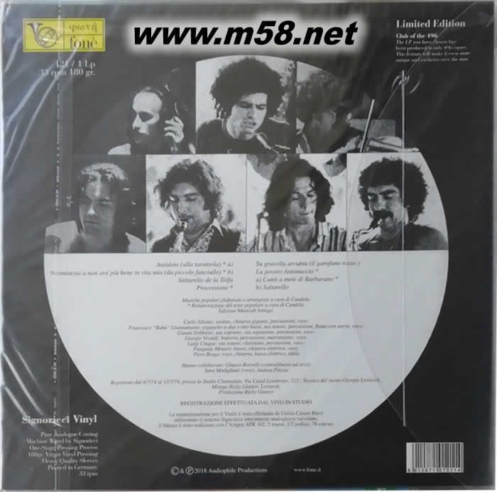 拉素民歌樂隊 [拉薩是我們的族類] Canzoniere del Lazio [Lassa Sta' La Me Creatura ] 黑膠(m58.net) Rita Marcorulli (鋼琴、女聲) 1. 上世紀七十年代意大利最具影響力的民歌組合「拉素民歌樂隊(Canzoniere del Lazio)」以承傳各地民歌為己任,特別擅長演繹他們的發源地拉素(Lazio)的傳統民謠,及后拓展至全意大利和地中海各地廣泛流傳的民族歌曲,樂曲題材豐富,可聽性更為動人。 2. 1974年樂隊制作之專輯[拉薩是我們的族類(Lassa Sta' La Me Creatura)]獲得一眾樂迷及専業評論一致贊賞和推崇 ,同時奠定了這組合在意大利及歐洲樂壇的地位,亦是樂隊采用清新純樸的民歌融入搖滾和爵士樂元素的實驗成功之作,使聆聽民歌的樂趣帶至到另一境界。 3. 專輯內的歌曲除了必定采用傳統樂器外,還加入了電結他和電子合成器,使樂曲的結構具更多變化,旋律演繹更為豐富和漂亮順滑,是將搖滾、爵士、新世紀和民族音樂的融合一起,可聽性更高。 4. 殿堂級錄音師利茲(Giulio Cesare Ricci)采用最頂級的器材,精巧的技術,以他所創的「利茲制式(Signoricci)」將這名盤原裝音源重新制作母盤,配合以SACD為載體,無論音色、音場和音效更為完美,與原來錄音的情況和形態極為接近。