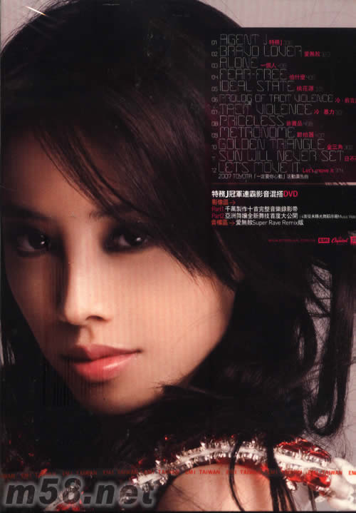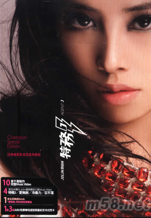 特務(wù)J(臺灣冠軍連霸影音混搭典藏版)(m58.net) ◎特務(wù)J冠軍連霸影音混搭DVD 1. 10首千萬製作完整Music Video 2. 4首從未曝光完整舞蹈示范Music Video 《特務(wù)J》《愛無赦》《冷暴力》《日不落》 3. 1首全民跳舞Remix - 「愛無赦」特別混音冠軍曲 ◎ 1套3張Jolin全新造型限量紀(jì)念冷光閃卡