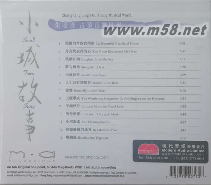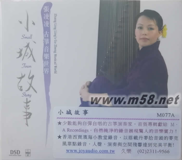 張凌凌[ 小城故事] 古箏音樂世界(m58.net) 美國獨立唱片廠牌MA Recordings老兼錄音怪杰Todd Garfinkle攜他的獨門錄音名器專程來港操刀錄音。對教堂錄音情有獨鍾的Todd Garfinkle,於西貢一所教堂,以原單點直刻錄音技術,把悅耳之堂音,自然理想之殘響,巧手稍加擺弄,成就這一張空前靚聲的中樂天碟。 少數能夠自彈自唱的古箏演奏家。首張專輯獻給 M.A Recordings,自然純凈的錄音展現驚人的音樂實力! ★ 位於香港西貢濱海小教堂錄音,以搭載丹麥拾音頭的麥克風單點錄音,人聲、演奏與空間殘響達到完美平衡! 張凌凌是少數能夠自彈自唱的古箏演奏家。自廈門大學畢業的她,現在在香港積極從事教學與演奏的工作。張凌凌將她首張個人專輯,獻給了以單點錄音聞名的 M.A Recordings,透過製作人兼錄音師陶德葛芬柯優異的錄音技術,帶來純凈而且自然不造作的音樂體驗。 透過張凌凌動人演奏與演唱,〈小城故事〉、〈月亮代表我的心〉更顯柔美動人,而〈平湖秋月〉、〈漁舟唱晚〉等古曲演奏,更展現張凌凌深厚的演奏實力。片尾更由張凌凌的老師、現為香港中樂團古箏首席羅晶演奏〈戰颱風〉,以古箏各種技法描述漁民與颱風搏斗的景象。本片位於香港西貢教堂錄音,堂音華美,不可錯過!