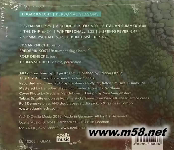 1. 埃德加‧尼赫特(Edgar Knecht)是德國現今最具音樂天份和創意的鋼琴爵士樂的演奏家和作曲家,他從十四歲開始已公開演奏自己的作品,獲得好評如潮,從此在歐洲樂壇踏上青云之路,跟著獲獎無數,備受歡迎。 2. 尼赫特最為人稱頌的是改編德國民歌以鋼琴爵士樂演奏,將傳統民俗文化融入現代表演藝術之中,這一創舉令他在古巴夏灣拿的爵士樂音樂節中大放異彩,贏得無盡掌聲和喝采。他亦以此方針製作了《利洛費早晨(Good Morning Lilofee)》和《在水深處舞動(Dance On Deep Waters)》兩個專輯,極受歡迎,現再接再勵,第三個專輯《個人季節(Personal Seasons)》再挑選了四首傳統民歌和三首他個人與四個季節有關的歌曲改編成鋼琴爵士樂四重奏,予人有美不勝收的效果。 3. 尼赫特與低音結他手羅爾夫‧丹歷克(Rolf Denecke)和鼓手托比亞斯‧舒爾特(Tobias Schulte)組成的三重奏合作多年,心領神會的默契加上超卓的演奏技巧,每次演出必大放異彩。這次他們更邀請德國著名爵士樂小號手弗雷德里克‧科斯特(Frederik Köster)參與製作此專輯,成為四重奏的演繹使原本旋律純樸優雅的歌曲更為色彩豐盈,明亮淳美。 4. 尼赫特的鋼琴演奏更為嫻熟清跪,感性中帶著優雅,流暢自然,配合科斯特氣量充沛,順滑如絲,線條分明的小號和夫呂號吹奏與丹歷克沉實富彈性的低音大提琴和舒爾特延伸能力非凡的敲擊,加上他們如入化境的互動,魅力十足的演奏令人傾心。 5. 此錄音製作由以模擬錄音(analog recording)馳名,位於德國奧斯納布呂克(Osnabrück)的法托里亞錄音室(Fattoria Musica)著名錄音師斯蒂芬·范·威利克(Stephan van Wylick)負責錄音和混音工序,而直刻金屬母盤(Direct Metal Mastering)由《老虎魚》工程師漢斯-約爾格•莫斯克斯(Hans-Joerg Maucksch)負責操刀, 以180克處女膠唱片為載體, 並顯赫的專業技術,聲音更精準,更自然,更富立體感,是另一鋼琴爵士樂四重奏的黑膠唱片示范盤。
