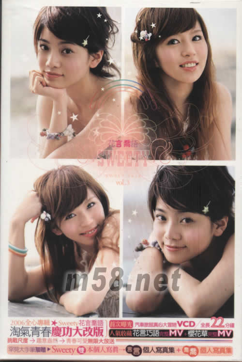 花言喬語(淘氣青春慶功大改版)(m58.net) 2006全心專輯 WEETY花言喬語 淘氣青春慶功大改版 挑戰尺度:趣意盎然:青春可愛無限大放送 罕見大手筆加贈 SWEETY雙本個人寫真 →言言個人寫真集+喬喬個人寫真集 首次曝光 汽車旅館真心大冒險VCD/全長22分鐘 人氣收藏花言巧語完整MV+櫻花草完整MV
