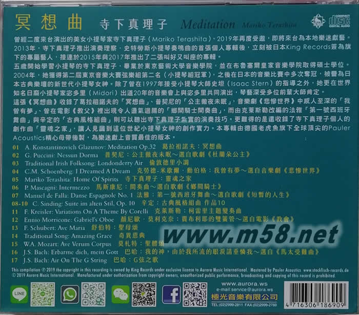 冥想曲 Mariko Terashita: Meditation(鬼斧神工CD)(m58.net) 曾經二度來臺演出的美女小提琴家寺下真理子(Mariko Terashita),2019年再度受邀,即將來臺為本地樂迷獻藝。2013年,寺下真理子推出演奏理察.史特勞斯小提琴奏鳴曲的首張個人專輯后,立刻被日本King Records簽為旗下的專屬藝人,接連於2015年與2017年推出了二張叫好又叫座的專輯。 五歲開始學習小提琴的寺下真理子,畢業於東京藝術大學音樂學院,並在布魯塞爾皇家音樂學院取得碩士學位。2004年,她獲得第二屆東京音樂大賽弦樂組第二名(小提琴組冠軍),之后在日本的音樂比賽中多次奪冠,被譽為日本古典樂壇的新世代小提琴女神。除了曾在1997年接受小提琴大師史坦(Isaac Stern)的指導之外,她更在世界知名日裔小提琴家宓多里(Midori)出道20年的音樂會上與宓多里共同演出,琴藝深受多位前輩大師肯定。 這張《冥想曲》收錄了葛拉祖諾夫的「冥想曲」、普契尼的「公主徹夜未眠」,音樂劇《悲慘世界》中感人至深的「我曾有夢」、曾在電影《教父》里出現令人盪氣迴腸的「鄉間騎士間奏曲」,而由克萊斯勒改編的法雅「第一號西班牙舞曲」與辛定的「古典風格組曲」則可以聽出寺下真理子扎實的演奏技巧。更難得的是還收錄了寺下真理子個人的創作曲「靈魂之家」,讓人見識到這位世紀小提琴女神的創作實力。本專輯由德國老虎魚旗下全球頂尖的Pauler Acoustics精心母帶后製,為本地樂迷獻上音質最佳的版本。