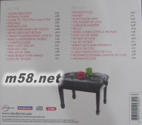 DISK 1 CD 1. You’re Beautiful 美麗的妳 2. Eternal Flame 永恆的火焰 3. Close To You (They Long To Be) 靠近你 4. Feelings 感覺 5. Perhaps Love 愛也許是… 6. Sometimes When We Touch 當(dāng)我們接觸時(shí) 7. We’ve Only Just Begun 我們才剛開始 8. I Want To Know What Love Is 我想知道愛是什么 9. What A Wonderful World 美好的世界 10. I Started A Joke 我開了個(gè)玩笑 11. And I Love You So 我是如此愛你 12. How Do I Live 我怎么活下去 13. Time After Time 一次又一次 14. Wind Beneath My Wings 翼下之風(fēng) 15. Love Me Tender 溫柔的愛我 DISK 2 CD 1. Without You 失去你 2. Mandy 蔓蒂 3. Don’t Know Why 不知為何 4. The Power Of Love 愛的力量 5. Careless Whisper 無心呢喃 6. Hello 哈囉 7. When A Man Loves A Woman 當(dāng)男人愛上女人 8. Dust In The Wind 風(fēng)中之塵 9. I’m Not In Love 我還未墜入情網(wǎng) 10. All By Myself 只剩下我自己 11. Rainy Days And Mondays 雨天和星期一 12. Stuck On You 戀上了你 13. I Only Have Eyes For You 我眼中只有你 14. Nothing’s Gonna Change My Love 對(duì)你的愛永遠(yuǎn)不變 15. Woman In Love 戀愛中的女人