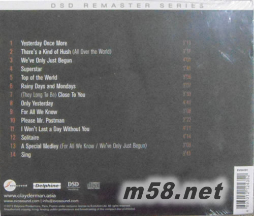 CLAYDERMAN PLAYS CARPENTERS 克萊德曼演奏卡朋特(m58.net) 收錄14首最好歌曲,包括YESTERDAY ONCE MORE TOP OF THE WORLD CLOSE TO YOU等等,
