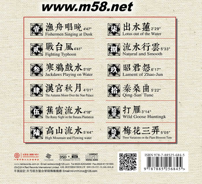 01..Fishermen Singing at Dusk 漁舟唱晚 04'47'' 02..Fighting Typhoon 戰(zhàn)颱風(fēng) 04'41'' 03..Jackdaws Playing on Water 寒鴉戲水 05'10'' 04..The Autumn Moon Over the Nan Palace 漢宮秋月 04'01'' 05..The Rainy Night on the Banana Plantation 蕉窗流水 04'18'' 06..High Mountain and Flowing water 高山流水 05'44'' 07..Lotus out of the Water 出水蓮 02'29'' 08..Natural and Smooth 流水行云 05'33'' 09..Lament of Zhao-Jun 昭君怨 06'17'' 10..Qing-San' Tune 秦桑曲 05'22'' 11..Wild Goose Huntingk 打雁 03'14'' 12..Three Variations on the Plum Blossom Tune 梅花三弄 05'05''