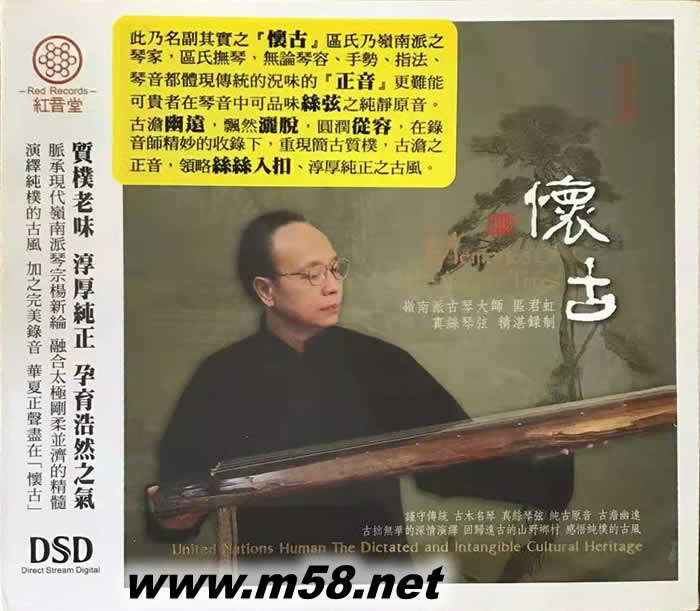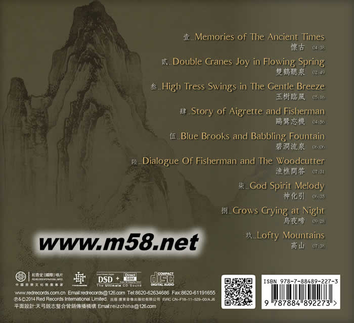 01 懷古 04'38'' Memories Of the Ancient Timos 02 雙鶴聽泉 02'49" Double Oranes Joy in Flowing Spring 03 玉樹臨風 05'17" High Tress Swings Swing in the Gentle Breeze 04 鷗鷺忘機 04'56" Story of Aigrette and Fisherman 05 碧澗流泉 06'06" Blue Brooks and Babbling Fountain 06 漁樵問答 07'31" Dialongue of the Fisherman and the Woodcutter 07 神化引 06'36" God Spirit Melody 08 烏夜啼 09'28" Crows Crying at Night 09 高山 07'38" Lofty Mountains