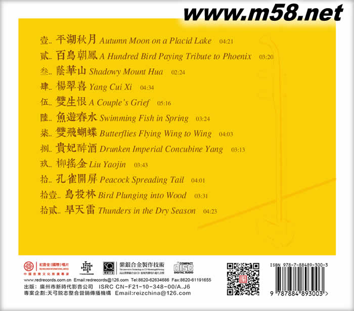 01 平湖秋月 Autumn Moon on a Placid Lake 04:21 02 百鳥朝鳳 A Hundred Bird Paying Tribute to Phoenix 03:20 03 蔭華山 Shadowy Mount Hua 02:24 04 楊翠喜 Yang Cui Xi 04:34 05 雙生恨 A Couple’s Grief 05:16 06 魚游春水 Swimming Fish in Spring 03:24 07 雙飛蝴蝶 Butterflies Flying Wing to Wing 04:03 08 貴妃醉酒 Drunken Imperial Concubine Yang 03:13 09 柳搖金 Liu Yaojin 03:43 10 孔雀開屏 Peacock Spreading Tail 04:01 11 鳥投林 Bird Plunging into Wood 03:31 12 旱天雷 Thunders in the Dry Season 04:23
