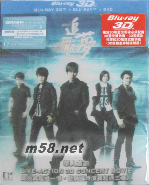 五月天追夢 3D+2D Blu-ray及DVD套裝 (Blu-ray) (限量珍藏版) (香港版)(m58.net) 臺灣天團五月天耗資逾億臺幣,兩年來橫跨新加坡、香港、北京、上海、臺北、臺中、桃園等地,共動用近50位攝影師拍攝3D演唱會片段,再配合三段故事和3D攝制技術,打造華人史上第一部演唱會現場表演結合故事劇情演出的3D實拍電影《五月天3DNA追夢》。故事以世界上最難追的票是五月天「五月天D.N.A.演唱會」為主,三個單元劇情由一張演唱會門票而起展開的追夢之旅,包括在廣州經營咖哩魚蛋小食店的父親(林雪飾)與熱情追星族的女兒、深夜在臺北里情傷的計程車司機(任賢齊飾)與一名神秘女乘客(劉若英飾)的大冒險故事、在上海勤奮的年輕快遞員每天努力工作,最大的心愿就是趕快存夠錢,帶妹妹去聽一場五月天的演唱會。