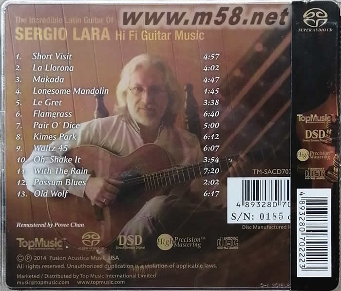 The Incredible Latin Guitar of HI FI 不可思議的拉丁吉他 SACD 限量版(m58.net) 獲得拉丁葛萊美獎提名的拉丁吉他大師,各式音樂樣樣精通,演奏風格元素豐富,包羅萬象! ★ 在本專輯中獨挑大樑彈奏自創樂曲,毫無冷場! ★ Povee Chan母帶重製,優異音質重現驚人演奏! 若您對火辣熱情的拉丁音樂著迷,絕對不能錯過塞爾吉奧羅拉精湛的拉丁吉他演奏。這位曾獲得拉丁音樂葛萊美獎提名的吉他大師,九歲開始學習古典吉他,並靠著聆聽不同類型的音樂汲取豐富的音樂養分,讓他的演奏摻揉佛朗明哥、藍調、搖滾、爵士等包羅萬象的風格節奏,演奏魅力橫掃美洲大陸各大音樂會與表演場所。 曾參與多張專輯演出,並與帕可迪魯奇亞、約翰麥克勞福林等吉他大師共同合作的塞爾吉奧羅拉。此次,他獨挑大樑,在這張最新專輯獨自演奏 13 首自行創作的樂曲。除了技藝超群的演奏,本專輯更由發燒廠牌 Top Music 的當家工程師 Povee Chan 母帶重製推出 Hybrid SACD,透過 DSD 的高取樣率格式,清晰傳達這位吉他大師演奏時的瞬間暫態細節,以及渲染力十足的動態變化。本片全球限量 1000 張,錯過此次以后便沒有機會了!