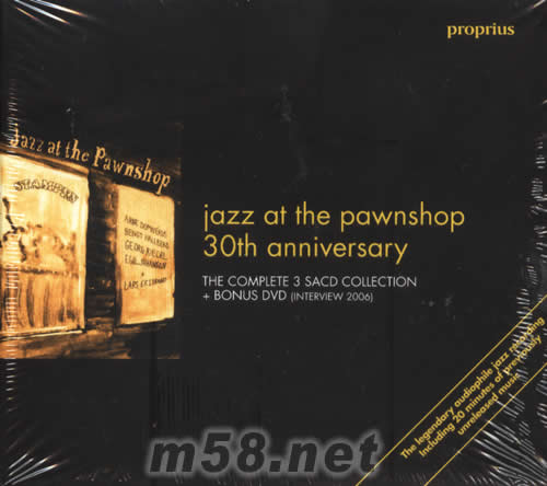 當鋪爵士JAZZ AT THE PAWNSHOP 30周年紀念版(m58.net) THE COMLITE 3 SACD COLLECTION +BONUS DVD(INTERVIEW 2006) The legendary audiophile jazz recording Including 20 miutes of previously unreleased music(從前不發行音樂的傳說中高保真音響愛好者爵士樂錄音包含20分鐘) 1976 年12月7日,在瑞典斯德哥爾摩舊城區的Stempen爵士俱樂部,舉行了幾場爵士熱演,其中包括瑞典最著名的薩克斯大師Arne Domnerus和顫音琴大師Lars Erstrand,以及鋼琴、貝斯與爵士鼓等五位名家的合力演出。俱樂部舞臺稍高出地面,許多顧客就坐在四周,錄音師Gert Palmcrantz則躲在小廚房,用總共三支立體麥克風和簡單的錄音器材很精確的記錄了演奏的細節與動態,音樂優美甘甜,空間的細微噪音也一并完整收集,所以現場感強烈,舞臺立體浮凸的在眼前呈現,即使不用多聲道系統,環境包圍感一樣叫人驚訝無比。聆聽這張唱片,你會情不自禁認為自己就置身現場,俱樂部內那種煙霧彌漫圍繞著酒酣耳熱,看著臺上樂手忘我盡情地演奏與爵士樂現場的那種即興鮮活感完全地保留與表現出來。 1977年演出的部分錄音由瑞典的寶碟Proprius公司制成雙黑膠LP唱片《Jazz at the Pawnshop》出版,由于錄音把俱樂部現場完美的重現立即成為爵士樂和發燒唱片的楷模,此后寶碟把其余的錄音制成了第二和第三集。此唱片傳入香港后,港人給它起了個響亮的名字:《當鋪爵士》。后來又有了CD版,HDCD版,XRCD版,SACD版等眾多的版本,此唱片也是有史以來版本最多的唱片之一。幾乎所有的音響雜志、收藏家都會推薦的專輯、對發燒迷與音響設計師與制造商來說,更是測試片的終極模板。 當鋪爵士30周年終極紀念版《Jazz at the Pawnshop 30th anniversary》,內容包括三張SACD外加一張DVD訪談,其中第三碟的第六、七曲是從未發表過的錄音。