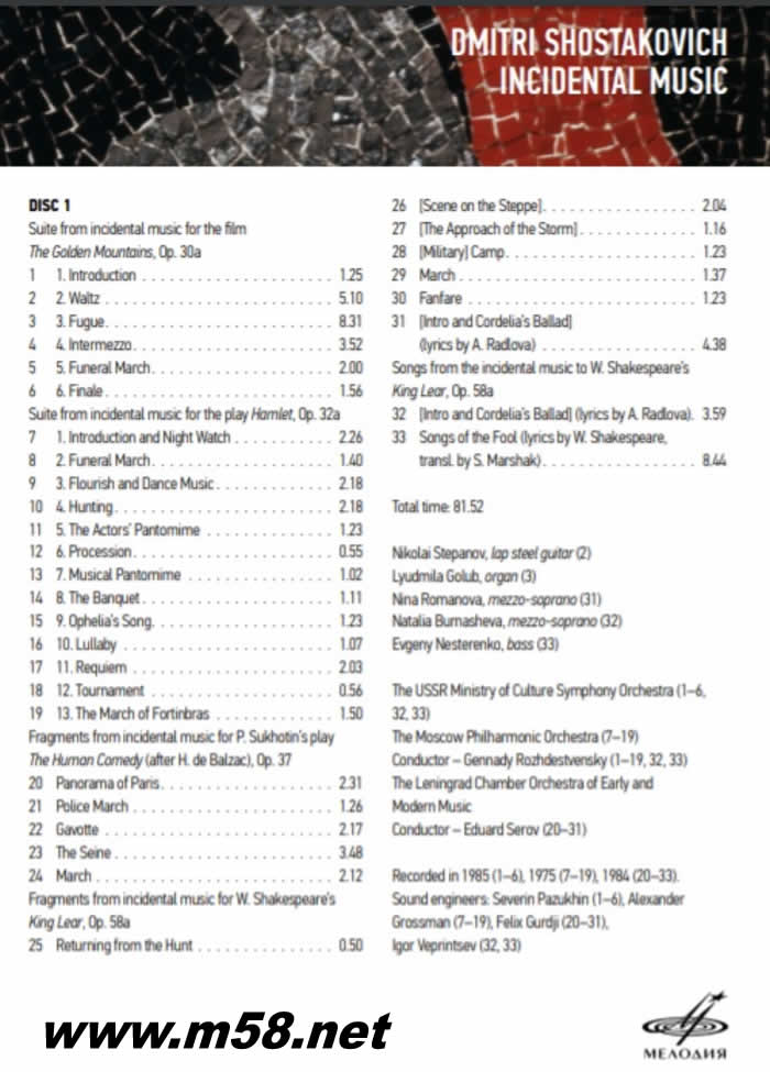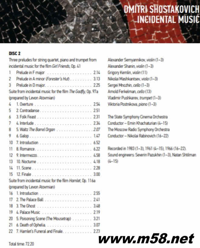 價格為估,以實到貨為準! 肖斯塔高維奇的電影配樂 Shostakovich: Incidental Music(m58.net) 輯錄多位俄羅斯傳奇音樂家珍貴錄音,原味十足! 包括: N. Romanova (女中音)/ V. Postnikova (鋼琴)/ G. Rozhdestvensky (羅日杰斯特文斯基 / 指揮)/ E. Serov (謝羅夫/ 指揮)… 黃金陣容演繹蘇聯電影:《金山》(1931)/ 哈姆雷特 (1964)/ 李爾王 (1971)/ 《牛虻》(1955)…等配樂