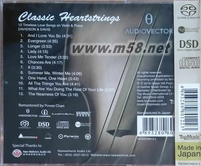 經(jīng)典金曲扣人心韻 CLASSIC HEARTSTRINGS 12 TIMELESS LOVE SONGS ON VIOLIN PIANO 小提琴與鋼琴 SACD專輯背面圖片
