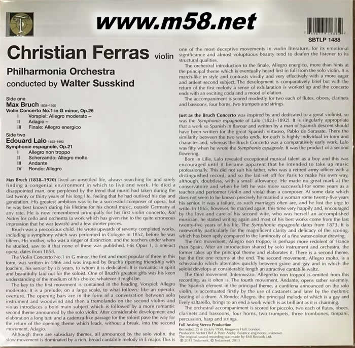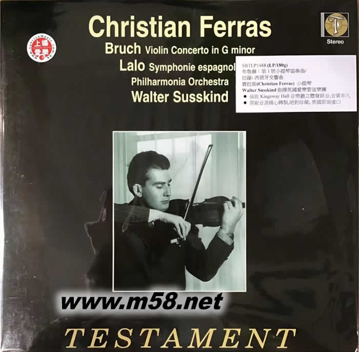 布魯赫:第1小提琴協(xié)奏曲,拉羅:西班牙交響曲 TESTAMENT 黑膠(m58.net) 倫敦Kingsway Hall音樂廳立體聲錄音,音質(zhì)非凡 原廠音源精心轉(zhuǎn)製,絕對珍藏; 英國原裝進(jìn)口