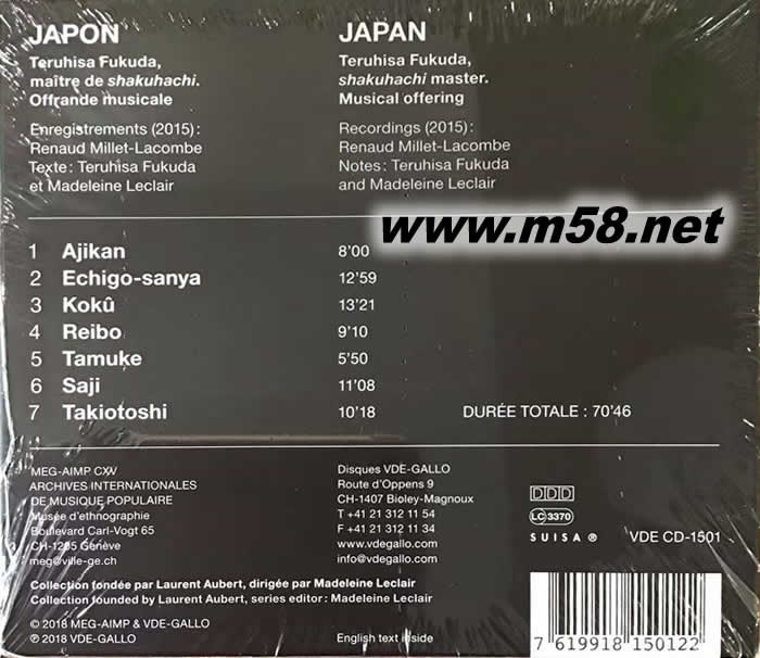 吹禪 尺八(m58.net) 正統(tǒng)日本尺八名演, 獲選入瑞士日內(nèi)瓦人類學博物館/ 國際民族音樂 檔案; 獲頒法國Academie Charles Cros學院<心弦獎(coup de Coeur)> 七闕獨奏 , 禪意盎然, 直入人心 錄音超卓,瑞士原裝進口