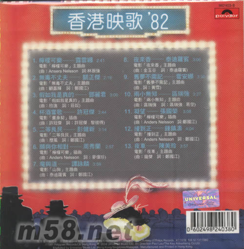 價格為估,以實到貨為準! 環球復黑王系列香港映歌82(m58.net) 檸檬可樂/夜來香/杯酒當歌/魔與道/無毒不丈夫/愿與你相對/二等良民/舊夢不須記/撞到正/假如我是真的/雨小知已/凝望/夜車