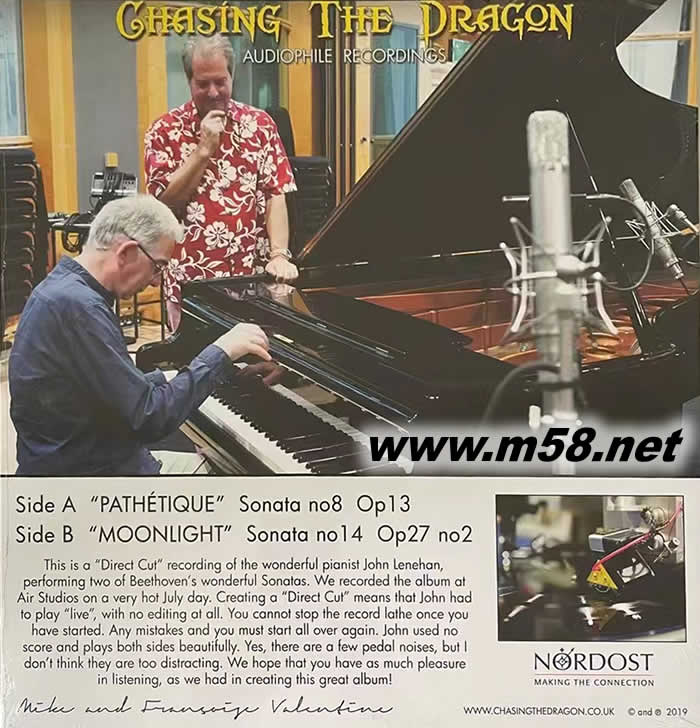 追龍公司這次選在教堂改造的 Air Studio 錄音,英國著名鋼琴家雷納漢演奏貝多芬經典鋼琴奏鳴曲,未經剪輯,你可以聽到踏板的聲音,空間感十足!以 Neumann VMS80 .古董真空管麥克風拾音,更賦予錄音如同 Live House 般的感動氣氛。180克直刻黑膠。