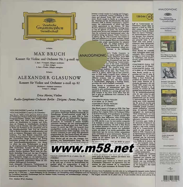 MAX BRUCH 布魯赫/格拉祖諾夫 小提琴協奏曲 奧地利女小提琴家 黑膠(m58.net) 20世紀世界小提琴大師中的女性先驅,上個世紀最迷人的女小提琴家艾麗卡.莫里尼以細膩的風格搭配弗里喬伊演奏布魯赫及格拉祖諾夫小提琴作品。180克黑膠。