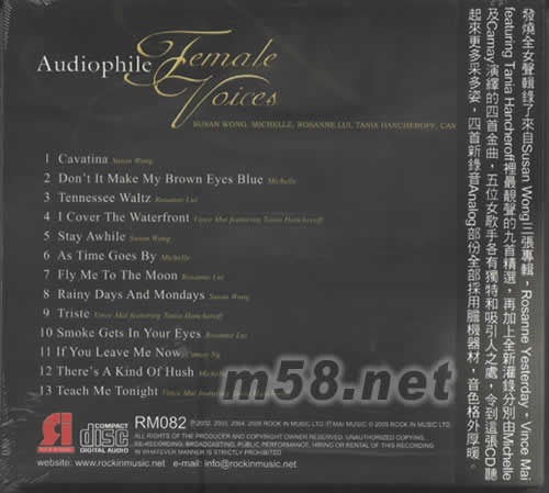 發(fā)燒全女聲(m58.net) HIGH RESOLUTION 24BIT/192KHZ DSP 發(fā)燒全女發(fā)聲 2005女聲發(fā)燒天碟第一擊 五位歌手13首超靚聲金曲9首精選+4首全新錄音全新制作 發(fā)燒全女聲輯錄了來自SUSAN WONG 三張專輯,ROSANNE YESTERDAY ,VINCE MAIFEATURING TANIA HANCHEROFF里最靚聲的九首精選,再加上全新灌錄分別由MICHELLE 及CAMAY演繹的四首金曲,五位女歌手各有獨(dú)特和吸引人之處,令到這張CD聽起來更多采多姿,四首新錄音ANALONG 部分全采用新機(jī)器材,音色格外厚暖