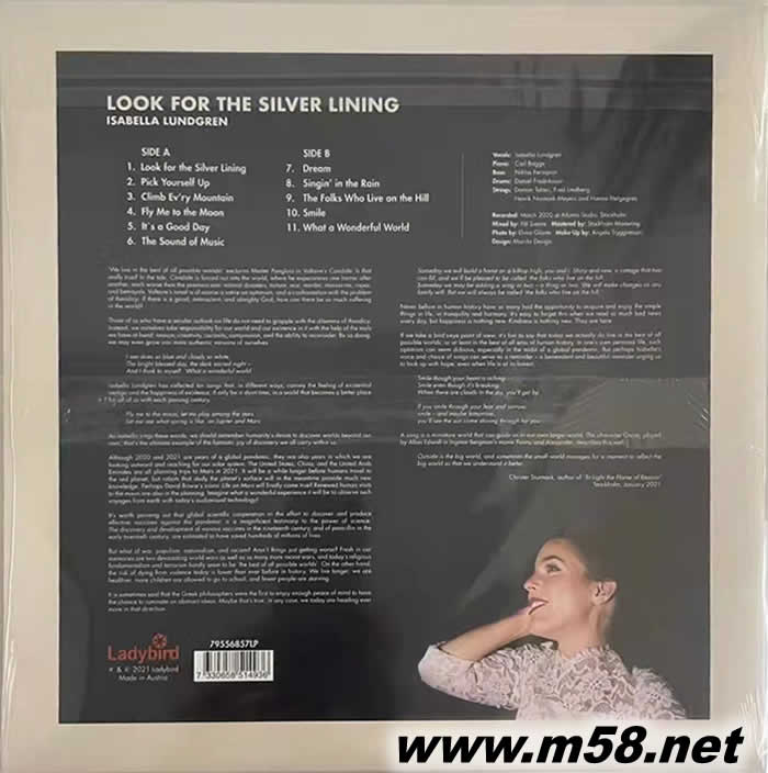 尋找一線希望 LOOK FOR THE SILVER LINING 黑膠(m58.net) 北歐爵士女聲ISABELLA LUNDGREN《LOOK FOR THE SILVER LINING》LP,來自瑞典的著名爵士歌手伊莎貝拉·隆格倫在她的第六張專輯中演奏多首經典爵士歌曲,如“Fly me to the Moon”、“Smile”和“What a Wonderful World”,以她特有的溫暖而略帶憂郁的聲音對這些歌曲進行了獨特的詮釋。專輯在斯德哥爾摩歷史悠久的亞特蘭蒂斯工作室錄制。與她合作的的都是現今瑞典著名的爵士樂手。180克黑膠。