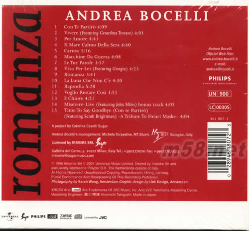 ROMANZA 浪漫情事 XRCD(m58.net) 在安德烈?波切利與莎拉?布萊曼合唱一曲“Time To Say Goodbye”(《告別的時刻》)造成全球轟動之后,安德烈?波切利他以跨越古典與流行的美聲,唱出了超越時空的情感,進而征服了全球千萬樂迷。因此,也可以說“Time To Say Goodbye”造就了安德烈?波切利與莎拉?布萊曼雙贏局面的音樂奇跡。 當1997年10月4日紐約時報以“征服萬人心的世紀男高音”的標題大篇幅報導安德烈?波切利的故事時,他的《浪漫情事》專輯正好在美國也打進告示牌雜志世界音樂專輯榜的第6名。另外,告示牌雜志也以原面頭條新聞報導安德烈?波切利是集合男歌星麥可?波頓的流行魅力、電影明星安東尼?班德拉斯的情感以及更勝拉丁歌王胡立歐浪漫的歌手。 出生在塔斯卡尼的意大利盲人歌手安德烈·波切利被稱為“第四大男高音”,他在古典輕歌劇中最激動人心的嗓音,甚至在歌劇界也是頗負盛名。他參與了帕瓦洛蒂(Pavarotti)1992年《Miserere》金曲專輯的錄制和意大利流行樂壇泰斗級人物Zucchero Fornaciari 1993年的世界巡唱,引起了國際性的關注。作為最成功的流行抒情歌手,他曾與席琳·迪昂(Celine Dion)、莎拉·布萊曼(Sarah Brightman)、艾羅斯·拉瑪佐第(Eros Ramazzotti)等著名歌手錄制對唱歌曲。和他在1995年逍遙音樂會上同臺表演過的艾爾·賈諾(Al Jarreau)評價說:“我有幸和全世界最優美的嗓音一起歌唱。”