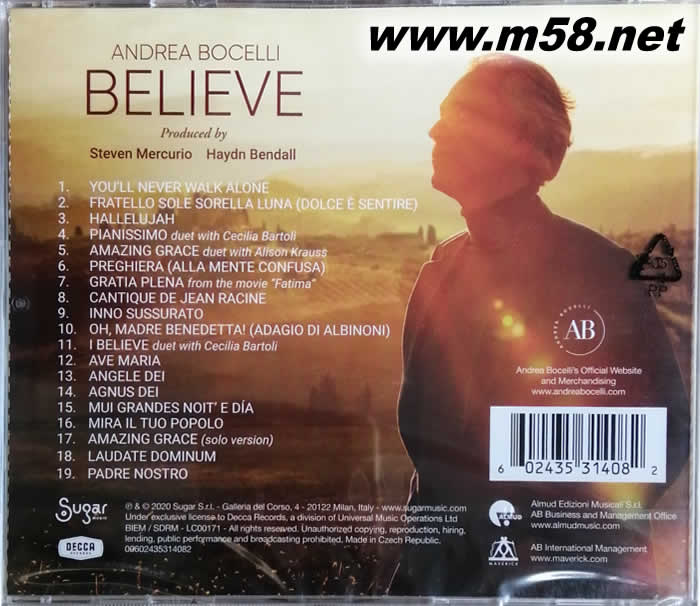Believe 相信愛 (19首歌)(m58.net) 僅管前方充滿風雨 請繼續(xù)相信愛 ★媲美上帝美聲 史上第一跨界男高音,全新大碟降臨 ★感動豪華版精選葛萊美獎女藝人Alison Krauss感動合作”AMAZING GRACE”、經(jīng)典再現(xiàn)”AVE MARIA” 、”PIANISSIMO”…等17首撫慰人心之極致美聲 他的嗓音被譽為上帝賜予人類的最美的恩典,他的歌聲觸動著全球數(shù)億樂迷的內(nèi)心,有著史上第一跨界男高音美譽的Andrea Bocelli,我們何其有幸能在這個時代之下聆聽宛如上帝親傳的天籟,2020年4月12日,Andrea Bocelli在全球疫情擴散期間破天荒選在空無一人的米蘭大教堂前,同步LIVE連線全球億萬聽眾演出「波伽利:希望之歌演唱會」,這一天他的歌聲讓全球樂迷動容落淚,同時也讓這次表演成為YouTube史上「最多人收看的古典現(xiàn)場直播演出」,如今更難能可貴的是,Andrea Bocelli在如此混亂的2020年宣佈推出全新專輯【Believe】。 Andrea Bocelli自1982年踏入樂壇至今,憑藉著天賦與努力,終於在歌唱中展現(xiàn)了遠超眾人的能耐,並且因此踏上了國際巨星的階梯、一路扶搖直上,最終達到了前所未有的高度,成為史上第一跨界男高音,全球累積超過9,000萬張專輯的銷售,並且被義大利以及多明尼加授予了國家勛章、受邀在梵蒂岡在天主教教宗前獻唱、甚至在冬季奧運閉幕典禮、美國總統(tǒng)歐巴馬的圣誕音樂會、上海世界博覽會開幕典禮、國際足總世界盃決賽,甚至英國皇家婚禮上,都能聽見他完美的嗓音。然而2020這個堪稱人類數(shù)百年來最黑暗的一年,新冠肺炎不分國界侵襲全球,讓許多人活在絕望低潮之中,Andrea Bocelli決心要在這個時刻透過音樂與自己的歌喉,帶給人們希望和鼓舞的力量,「”相信(Believe)”這個詞背后帶表了三個意義:信仰、希望和善行,這是必備的三種美德,但是當跳脫出宗教,我認為信仰、希望和善行帶給所有人活著的意義,並且讓人們因此而完整」,帶著這樣的心境和意念,Andrea Bocelli在最艱困的時代之下,為所有人帶來這張【Believe】。 【Believe】由古典雙大師Steven Mercurio與Haydn Bendall(莎拉布萊曼、美聲男伶)聯(lián)袂操刀打造專輯,為Andrea Bocelli薰陶出最雋永完美的新世代作品;開場的歌曲”You’ll Never Walk Alone”,以音樂溫暖人心作為重點,透過感動人心的嗓音,體會到旋律的溫度和美妙;萬世不朽的名曲“Amazing Grace”,由葛萊美獎最多獲獎女藝人Alison Krauss 入陣獻唱,精彩合作形成令人動容的美妙天籟,塑造出跨越顛峰的極境之聲;除此之外,與知名次女高音Cecilia Bartoli共同演唱的經(jīng)典歌劇曲目”Pianissimo”、 傳奇作曲家Ennio Morricone為電影【法蒂瑪?shù)钠孥敗克V之名曲"Gratia Plena"等,都可以聽見這位史上第一跨界男高音用無與倫比的歌聲且精致洗鏈的技巧,讓人們徜徉在樂海的時刻忘卻現(xiàn)實中的煩惱和痛苦。【Believe】是當今所有人都該追隨的一張信仰之作,更是這個時代之下最激勵人心的完美作品。