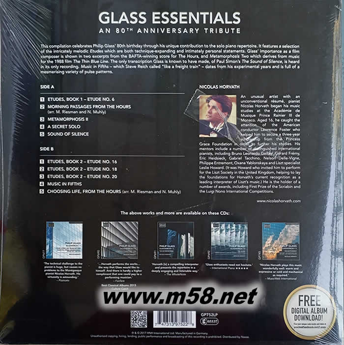 菲利普 格拉斯:鋼琴獨奏精華集 GLASS ESSENTIALS 80周年 黑膠(m58.net) 這張專輯是慶祝二十世紀最勇于突破,也最有影響力的美國作曲家菲利普格拉斯的80歲生日而制作的鋼琴獨奏專輯。包括:練習曲、清晨時光、變形記、簡約世界等經典作品,錄制格拉斯全系列專輯尼古拉斯霍瓦特對格拉斯的詮釋不容置疑。180克黑膠。