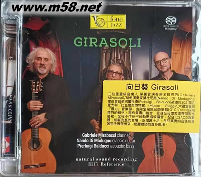 向日葵 Girasoli (單簧管與吉它)SACD(m58.net) Gabriele Mirabassi (單簧管) Nando Di Modugno (結(jié)他) Pierluigi Balducci (結(jié)他) 1. 出生於意大利佩魯賈(Perugia),父親亦是音樂人的單簧管演奏家加布里埃爾‧米拉巴西(Gabriele Mirabassi),自幼受庭訓(xùn),並進(jìn)入莫拉基音樂學(xué)院(Morlacchi Conservatory)接受正統(tǒng)音樂訓(xùn)練,加上天份極高,無論是古典或是爵士樂他都能精準(zhǔn)地把握和詮釋,以演奏單簧管和鋼琴最為出色,曾出版多個(gè)專輯,廣獲好評。