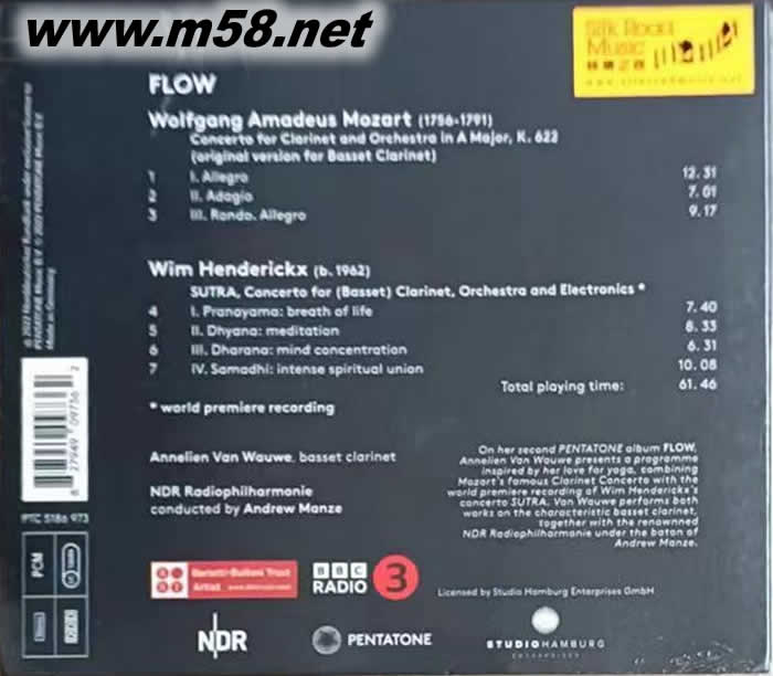 流動 FLOW(m58.net) 1. 來自比利時,曾獲得多個國際音樂比賽包括2012年ARD慕尼黑國際音樂大賽等大獎及於2015年被英國廣播公司選為"新一代藝術家(BBC New Generation Artist)"的年青單簧管吹奏家安娜琳‧梵‧瓦維(Annelien Van Wauwe)以吹奏嘹亮明朗,生動卻富表情,音色純凈、恬美和清澈見稱。瓦維不但擅長吹奏傳統的古典樂曲,對於近代作品的演繹,她的表現更是可圈可點。
